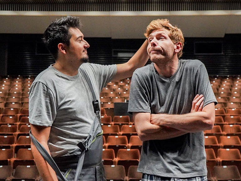 U predstavi igraju dva mlada glumca, Konstantin Haag i Faris Pinjo, također dva različita glumačka habitusa, a opet obojica pobornici psihološkog realizma sa izrazito romantičnim pogledom na teatar. Dva zanesenjaka komedijom i poznata televizijska lica.
