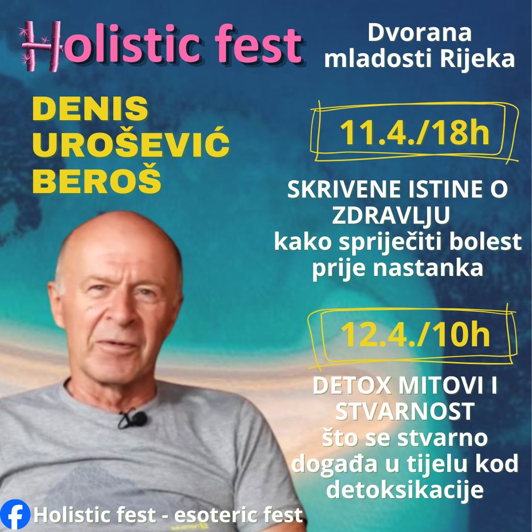 Holistic fest ugostit će ovog proljeća jednog od najtraženijih nezavisnih istraživača, predavača i autora iz područja prirodnog očuvanja zdravlja i prehrane – Denisa Uroševića Beroša. Na subotnjem predavanju ćete naučiti kako prepoznati rane znakove bolesti, donijeti odluke koje štite vaše tijelo i um, te praktične korake koje možete poduzeti prije nego što bolest uopće nastane. Drugi dio predavanja su pitanja i odgovori. U nedjelju Denisovo predavanje razotkriva mitove i stvarnost detoksikacije, objašnjava kako rade jetra, bubrezi i limfni sustav, te koje navike zaista podržavaju prirodnu sposobnost tijela da se očisti. Želite li osobne konzulatacije PONESITE SVOJE DIJAGNOZE. Denis Urošević Beroš hrvatski je dipl. ekonomist koji se već desetljećima bavi temama zdravog života, prehrane i tjelesne kondicije. Iako po struci nije medicinski stručnjak, od mladosti se intenzivno interesira za područja medicine, biologije i kemije, posebno u kontekstu prehrane i utjecaja životnog stila na zdravlje čovjeka i postao je jedan od najslušanijih promotora zdravog načina života i prehrane. Sport i tjelesna aktivnost važan su dio njegovog života još od školskih dana. Tijekom godina trenirao je različite sportove i sudjelovao u zahtjevnim disciplinama poput biatlona, triatlona, maratona, borilačkih sportova, košarke i malog nogometa. Dugogodišnje iskustvo u sportu potaknulo ga je na istraživanje utjecaja prehrane i dodataka prehrani na fizičku spremnost i opće zdravlje testirajući na sebi različite prehrambene kombinacije. Beroš je poznat kao pobornik zdrave prehrane i aktivno predaje o temama poput prehrane po krvnim grupama, prehrane sportaša, učinka prehrane na zdravlje, te o virusima poput EBV-a (Epstein-Barr virus) .