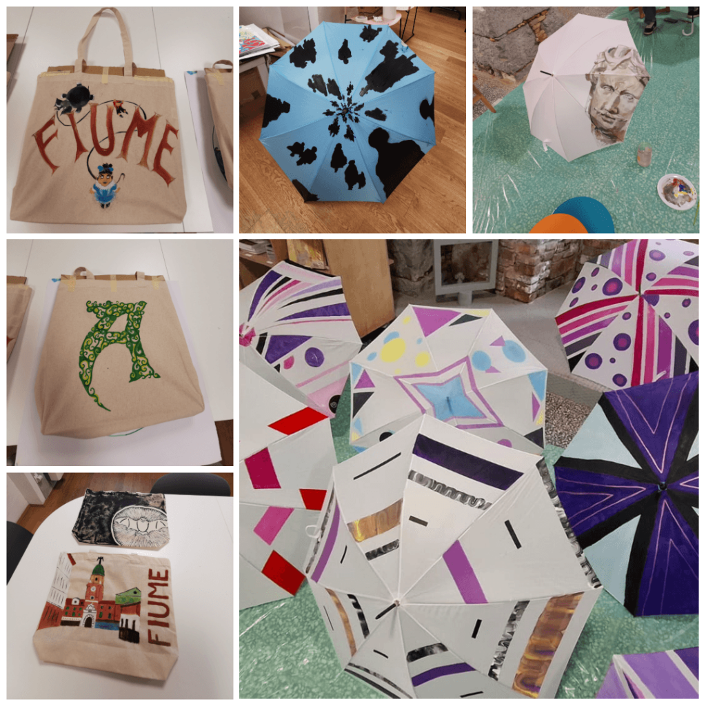 Radove su stvarali učenici Prve riječke hrvatske gimnazije, Građevinsko tehničke škole Rijeka, Škole za trgovinu i modni dizajn Rijeka te Škole za primijenjenu umjetnost Rijeka, pod mentorstvom umjetnika Jadranke Lacković, Tanje Blašković, Emanuele Santini i Alena Šimokovića. Izložba donosi prikaz kreativnog procesa nastalog kroz radionice i posjete ateljeima riječkih umjetnika te izložbu oslikanih kišobrana i platnenih torbi inspiriranih fundusom dvaju muzeja.