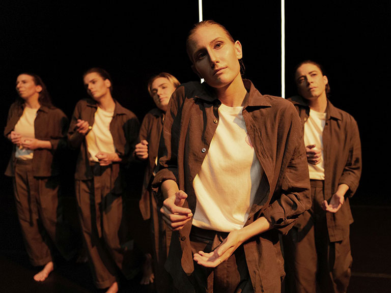 Pet izvođačica kreće se kao jedno. Pokreti koji se čine jednostavnima otkrivaju se kao čini izdržljivosti, podsjetnici na granice i mogućnosti tijela. Izvođači se razlijevaju u kolektivnu sliku u kojoj se granice individualnosti ublažavaju. Njihovi pokreti prizivaju i utjehu i nelagodu pripadanja: privlačnost konformizma, radost zajedništva, trenje različitosti. Ono što izbija na površinu jest paradoks – zajedništvo koje nikada ne briše jedinstvenost, i jedinstvenost koja postaje vidljiva tek kroz kolektiv.