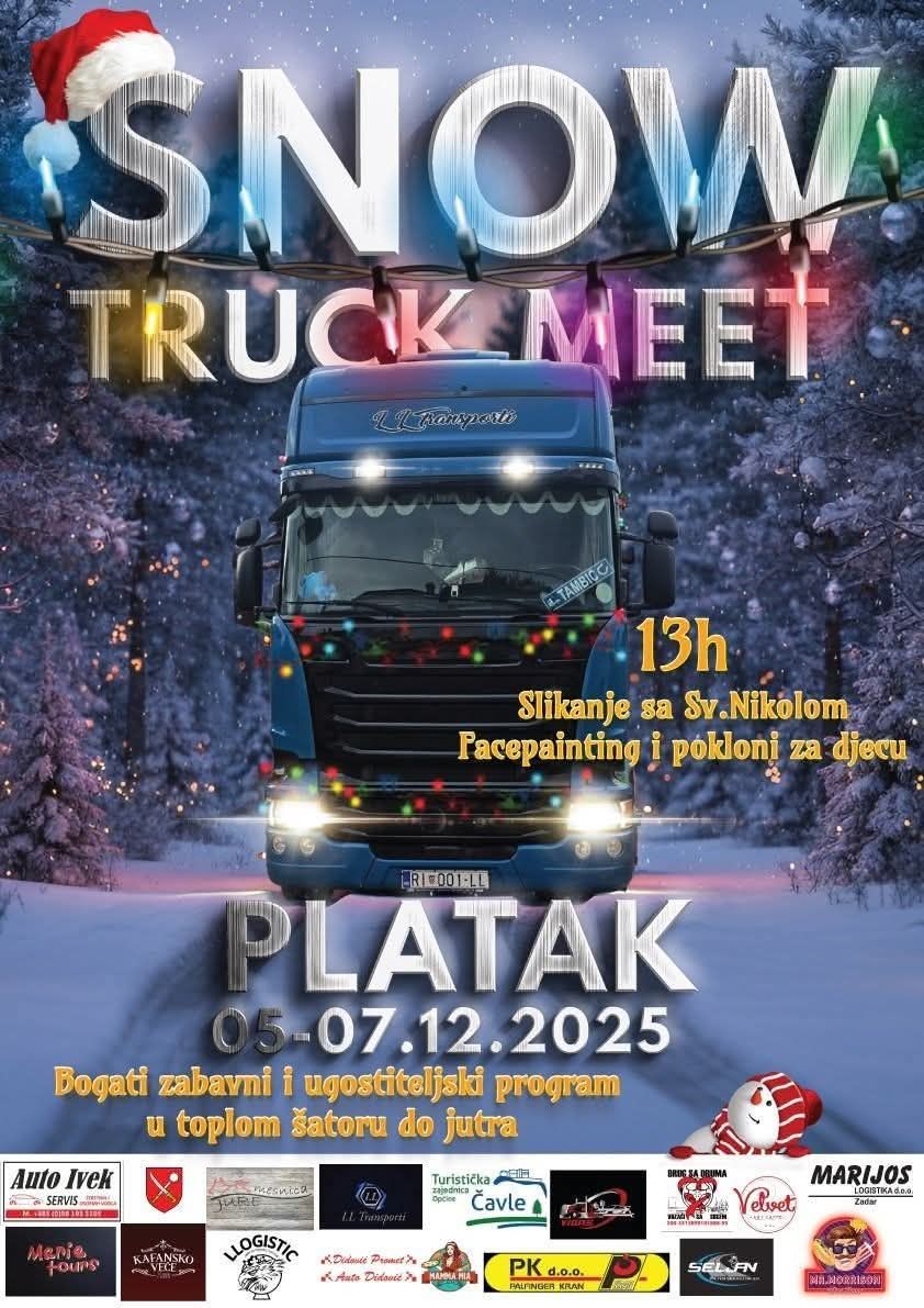 Od petka, 5. do nedjelje, 7. prosinca, na Platku će se održavati Snow Truck Meet. Posjetitelji će imati priliku vidjeti ukrašene kamione i svjetlosni spektakl. U subotu, 6.12. će u 13:00 sati biti slikanje sa Svetim Nikolom, facepainting i pokloni za djecu, a u toplom šatoru će se odvijati bogat zabavni i ugostiteljski program do kasnih sati. Svi prethodno prijavljeni imat će priliku sudjelovati u kvizu općeg znanja na visini. Sve dodatne informacije o događaju potražite na stranicama organizatora: https://www.facebook.com/TruckMeetRijeka.